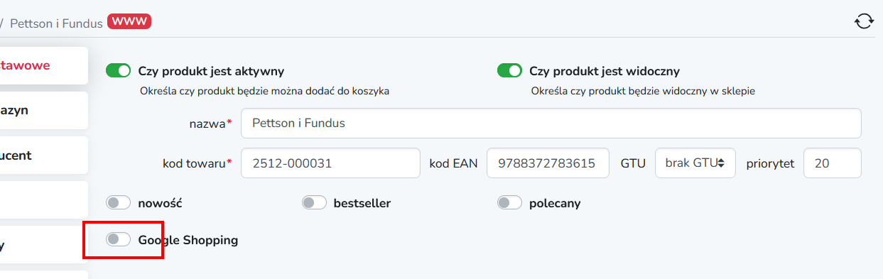 Jeśli w sekcji Wybór danych została wybrana opcja produkty oznaczone Google Shopping lub tylko aktywne produkty oznaczone Google Shopping to należy przejść do produktu który ma być dodany do pliku pobieranego przez Google Merchant Center Next a następnie należy w sekcji Informacje podstawowe zmienić przełącznik Google Shopping z koloru szarego na kolor zielony.