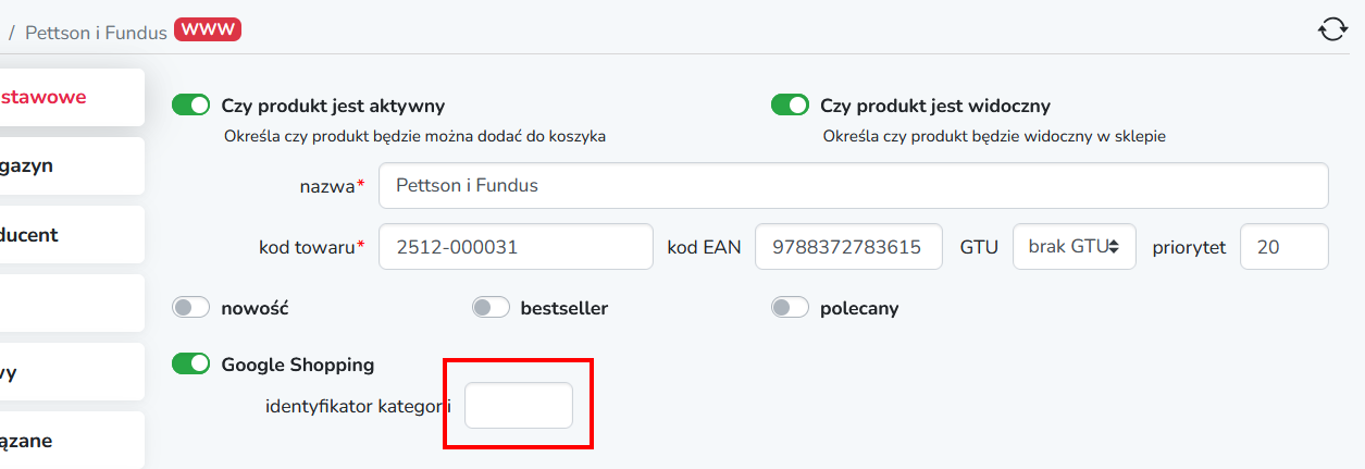 W momencie zmiany przełącznika z koloru szarego na kolor zielony w sekcji Google Shopping pojawi się dodatkowe pole umożliwiające podanie identyfikatora kategorii.